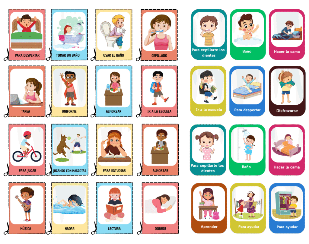 Tarjetas con imágenes claras y coloridas que ayudan a los niños que aún no saben leer a entender y seguir sus actividades con autonomía.